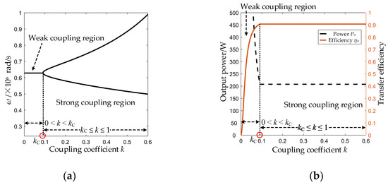 Curve of the relationship between system transmission characteristics and coupling coefficient k: (a) operating angular frequency ω; (b) output power and transfer efficiency. (The system parameters are: the effective value of input voltage Vin = 50 V, the natural resonance frequency f0 = 100 kHz, the internal resistance rT = rR = 0.5 Ω, and the load resistance RL = 10 Ω).