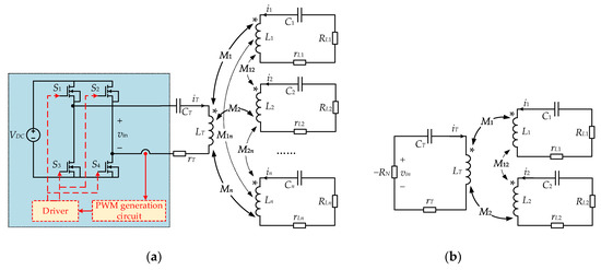 Schematic of multi-load PT-WPT system using series-series topology with self-oscillating full-bridge inverter: (a) system structure with n loads; (b) equivalent circuit of the dual-load PT-WPT system.
