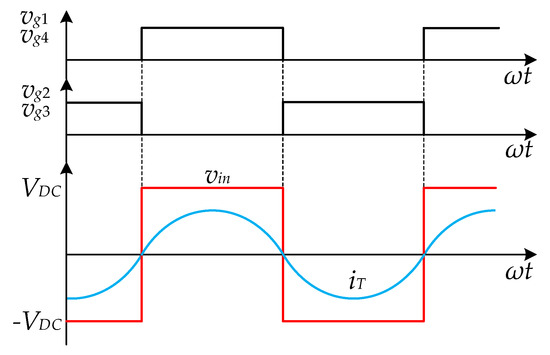 Assuming the direction of current iT and voltage vin shown in Figure 3 is positive, Figure 4 shows that the phase difference between vin and iT is 0°, which means generating energy. Therefore, the full-bridge inverter can also be equivalent to a negative resistance −RN, as shown in Figure 3b.