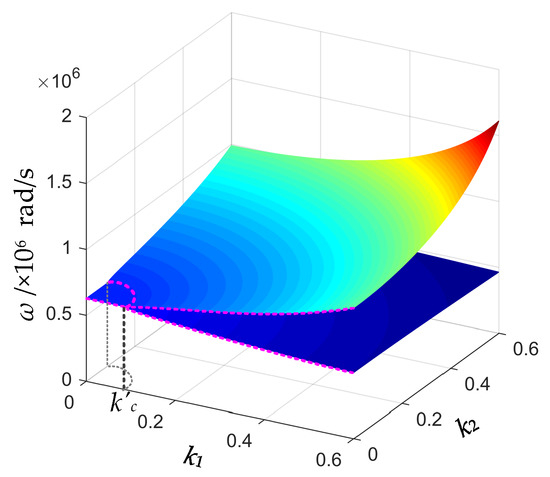 Based on the above analysis, it can be found that there are also two regions containing solutions of Equation (13), depending on the coupling coefficients k1 and k2, as shown in Figure 5. In the strong region (), which is called the PT-symmetric phase, the system supports two modes with two solutions of angular frequency; the gain of the system is fully balanced with all the losses. It is worth noting that the system can only work at one frequency at any time, and the system automatically adjusts the angular frequency with the change of k1 and k2, due to the nonlinear saturation gain. In the weak coupling region (), which is called the PT broken phase, only one mode is located at ω = ω0.