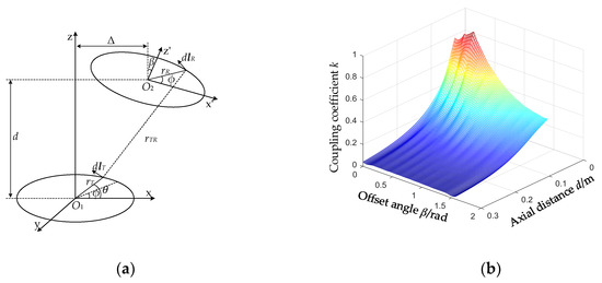 Equation (22) shows that, for a dual-load PT-WPT system with known system parameters, the power and transfer efficiency of different loads only relate to the coupling coefficients k1 and k2. Therefore, before discussing the power distribution under different coupling situations, the relationship between the coupling coefficient and the coils’ position should be obtained first. The spatial arbitrary position of the two planar coils is shown in Figure 6a, where r′T and r′R are the radius of transmitting coil and receiving coil, respectively, d is the axial distance, Δ is the horizontal lateral shift distance between the centers of the two coils, and β is the offset angle between the normal directions. Further, the coupling coefficient k between two planar coils is a function of β, d, and Δ [31].