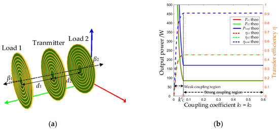 Schematic diagram of power distribution when k1 = k2: (a) loads position; (b) output power and transfer efficiency of system and each load. (In the figure, “theo” is the abbreviation of “theory”, which represents the theoretical value, the same below.)