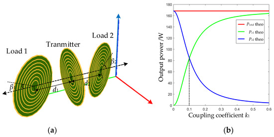 In this case, Load 1 and Load 2 are located on both sides of the transmitter arbitrarily. Suppose that Load 1 is first placed at a certain position (β1, d1) and Load 2 is placed at (β2, d2), as shown in Figure 8a. So, the coupling coefficients k1 and k2 can be calculated according to Equation (23) or by scanning Figure 6b. According to Equation (22), the output power of Load 1 and Load 2 can be obtained: