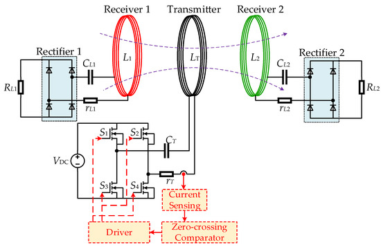 Wireless power transfer (WPT) is a kind of technology that does not need wires or other physical connection and transmits electricity through the air. It has the advantages of flexible power supply and no cable constraints. In recent years, WPT technology has been widely used in portable electronic equipment, smart homes, electric vehicles, rail transit, implantable medical power supplies, or other fields. In the future, WPT technology will have broad application prospects in energy anomaly consumption detection [1,2], simultaneous wireless information and power transfer (SWIPT) [3,4], and so forth. However, the common wireless charging products on the market are mostly based on a single load at present. With the increasing number of electronic products with wireless power receiving function, the single-load WPT system cannot meet the demand of wireless power supply for multiple devices at the same time.