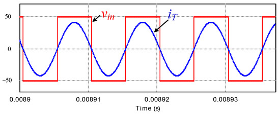 Substituting the parameters of Table 2 into , the critical coupling coefficient k’c = 0.091. The simulation waveform of the output voltage vin of the full-bridge inverter and the input current iT flowing through the transmitting coil is shown in Figure 10, with a phase difference of 0°, and means generating energy. Therefore, it can be equivalent to negative resistance −RN, which is satisfied with theoretical analysis in Figure 4.