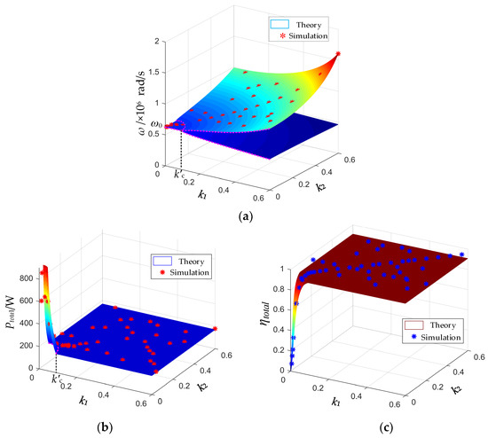 Furthermore, several different groups of k1 and k2 are randomly selected for simulation. The comparison between the simulation value and the theoretical value of the system operating angle frequency, total output power, and transfer efficiency are shown in Figure 11. Within the error range, the theoretical value is consistent with the simulation result. Figure 11a shows that the system’s operating angular frequency ω is always equal to the natural resonant angular frequency ω0 (ω0 = 2πf0 ≈ 0.628 × 106 rad/s) in the weak coupling region, while in the strong coupling region, the system’s operating angular frequency is automatically adjusted as the coupling coefficients k1 and k2 change. It can be clearly seen from Figure 11b,c that the total output power of the system always remains at 175 W with constant transmission efficiency 95% when the coupling coefficients k1 and k2 change in the strong coupling region, which is not affected by the load position. However, once the system works in the weak coupling region, the total output power of the system will rise sharply, and the transfer efficiency will drop rapidly, which not only reduces the transmission performance, but also may produce a lot of heat to burn the circuit. So, in practice, it should be avoided to work in the weak coupling region.