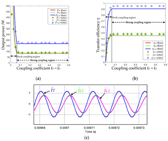 Substituting Equations (10)–(13) into Equation (9), the effective value of coil currents iT, i1, i2 can be obtained. Then, the total output power Ptotal and transfer efficiency ηtotal in the strong coupling region or P’total and η’total in the weak coupling region, the ith load’s output power Poi, and transfer efficiency ηoi can be expressed as follows (i = 1, 2).
