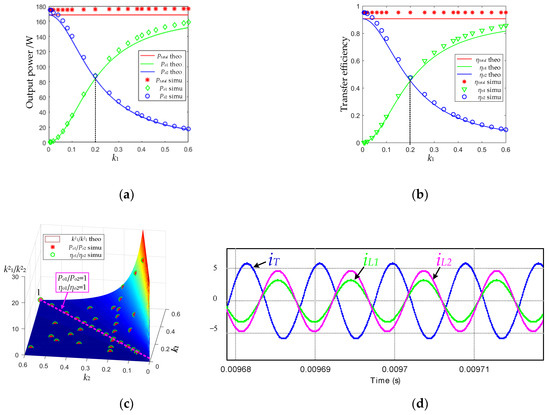 When k1 ≠ k2 and , the power distribution and efficiency distribution are as shown in Figure 13. In order to better demonstrate the power and efficiency distribution in the strong coupling region, the coupling coefficient k2 = 0.2 of Load 2 is assumed to be fixed, and the coupling coefficient k1 of Load 1 is changed from 0 to 0.6. In this case, the relationship of the output power and transfer efficiency of the two loads with the coupling coefficient k1 is shown in Figure 13a,b. It can be seen that the output power and efficiency of each load vary with the coupling coefficient and cannot be kept at a constant value, although a load position remains unchanged. Furthermore, the greater the coupling coefficient is (that is, receiver is closer to transmitter), the greater the output power and efficiency are. Further, taking any value of k1 and k2, the simulation results are as shown in Figure 13c. The ratio of output power and efficiency of each load falls on the surface of the square ratio of coupling coefficients k1 and k2. One of the waveforms of the input current iT and the output current iL1 and iL2 is shown in Figure 13d; the effective values of iT, iL1, and iL2 are 3.20 A, 4.65 A, and 5.74 A, respectively. It can be calculated that the ratio of the output power of the two loads Po1/Po2 ≈ 0.44 and the efficiency ratio ηo1/ηo2 ≈ 0.44, which is consistent with theoretical analysis.