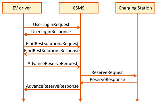 The EV driver starts the operation sending the UserLoginRequest message to the CSMS. The CSMS sends a query to the DataBase (not highlighted in Figure 2) and replies to the EV driver with the UserLoginResponse. In case of positive response, the EV driver sends the FindBestSolutionsRequest asking information on a possible advance reservation on the basis of his/her requirements. The CSMS replies, consulting the information on the DataBase, with some possible charging solutions using the FindBestSolutionsResponse message. Then the EV driver, if satisfied by the proposal, sends the AdvanceReserveRequest to perform the reservation. The CSMS exchanges information with the Charging Station using the ReserveRequest and ReserveResponse messages. Then, the CSMS replies with the AdvanceReserveResponse to the EV driver concluding with a positive or negative response to the reservation request.