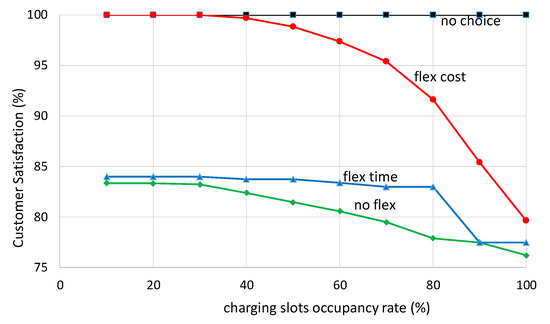 Figure 7 reports the satisfaction of the customer that accepts the reservation, on average over the 50 simulations, as a function of the slot occupancy of the Charging Station for the different test cases. For the “no choice” test, the customer satisfaction cannot be properly defined, it has been fixed to 100% since the solution proposed to the user is the only one they desire, if it is possible, and the user accepts the price fixed by the Charging Station. In general, the consumer satisfaction decreases increasing the slot occupancy, being more probable that the user request cannot be satisfied without modifications. In the case of maximum cost flexibility, the satisfaction is always high since the user does not care for the cost. In the “no flex” case user the flexibility on their specifications is low. The average satisfaction is the lowest with respect to the other tests. The user accepts the solution when the satisfaction is above the threshold. In the “flex time” case, the satisfaction is not high but independent on the slot occupancy since the user accepts a delayed recharge. The satisfaction decreases only when the cost increases due to the lack of slots.