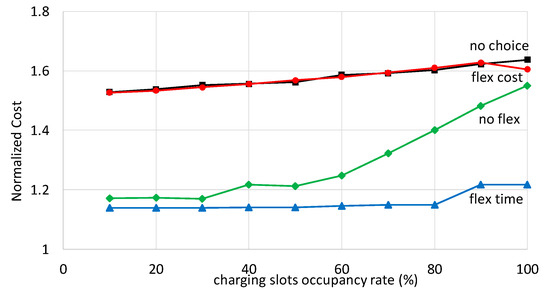 Figure 9 reports the normalized average cost as a function of the slot occupancy. The cost increases increasing the slot occupancy, being the user forced to accept higher cost for the recharge. In the cases of maximum cost flexibility (“no choice” and “flex price”), the cost is always higher with respect to the other cases. The average income of the Charging Station increases, being the customer more interested on other aspects and not on the price.