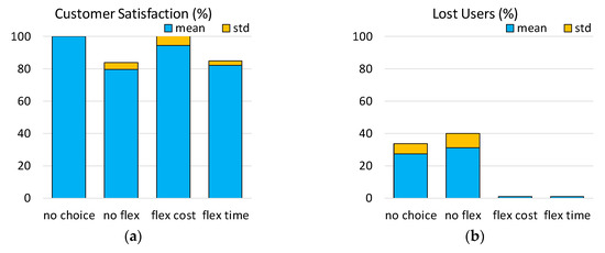 (a) Customer satisfaction and (b) lost users (mean and std dev) for different test cases.