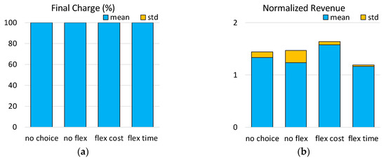 Figure 10, Figure 11, Figure 12 and Figure 13 show the mean value and the standard deviation of the performances considered: customer satisfaction, lost users, used power, used slots, final charge, normalized revenue, normalized time for recharge, and initial time variation. Additional considerations can be carried out analyzing the results reported in Figure 10, Figure 11, Figure 12 and Figure 13.