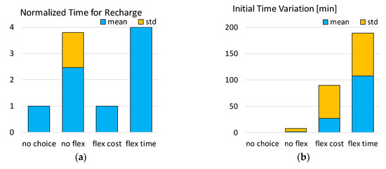 Figure 13a shows that a fast recharge is used when the system is not flexible (“no choice”) or the user is less interested in the cost (“flex cost”). In the “no flex” and “no choice” scenario the start recharge time is the desired time as shown in Figure 13b. This result confirms the fact that many users are lost if the desired time slot is not available, as shown in Figure 10b.