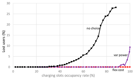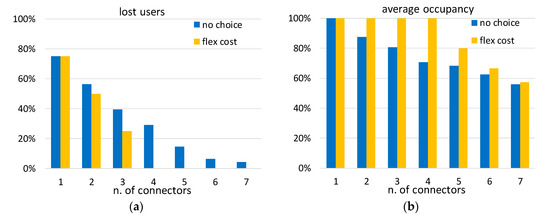 The results reported in Figure 10b show that users are not lost when both user and system are flexible (“flex price” and “flex time”). The no choice scenario is equivalent to the actual case of no reservation: if all the connectors are occupied the user goes away. This situation is critical when the number of connectors is low, 4, with respect to the possible users, like in the example of this simulation.