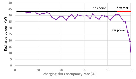 Figure 15 reports the average value of the recharge power as a function of charging slot occupancy. In the “no choice” case the user is forced to a fast charge, in the “flex cost” case the user prefers a fast charge since they have no problems on the cost, in the “var power” case the user prefers a fast charge but is forced to a slower 22 kW or 11 kW charge, when in the desired recharge time the power limit is reached.