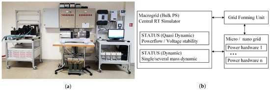 While power system stability used to be widely accepted as a Bulk Power System (macrogrid) problem, the micro-, mini-, and nanogrid concepts which are feasible today allow more efficient and reliable system stability support functions based on local and distributed control []. To determine the impact on the macrogrid stability and the right settings of this control, a PHIL with the architecture shown in Figure 1b is used. It consists of a central RTSM representing the macrogrid using the STATUS quasi-dynamic and dynamic software. The STATUS quasi-dynamic module provides power flow and voltage stability analysis with a rich set of detailed stability indicators. Combined with the STATUS single/several mass dynamic model the frequency dynamics are given. Through the grid-forming unit the voltage and frequency (U,f) signals are amplified and transferred to the micro/nanogrid power DuT. In each RT time step, the computed power system stability indicators provide feedback on the efficiency of the actions performed by the local control.