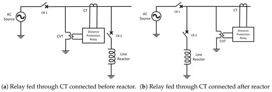 To carry out the HIL study, a protection IED used at POWERGRID substations was interfaced with the RTSM and associated with one end of the modeled line. In order to visualize the impact of reactor current, two cases were studied. Figure 4 shows the position of the current transformer (CT) connection for both cases. In the first case, the current to the IED was fed from the CT connected between the source and reactor as shown in Figure 4a (reactor current included) and in the second case the IED was fed through the current from the CT connected towards the line, after the line reactor (reactor’s current excluded) as shown in Figure 4b.