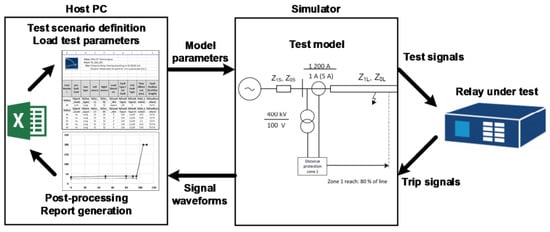The IEC 60255-121 standard specifies the minimum requirements for functional and performance evaluation of distance protection functions. It defines the tests to be performed in order to assess the relay characteristics such as operate time, transient overreach, phase selection, etc. In contrast to standard relay test sets, using a RTSM allows closed-loop testing of relays by simulating the power system, generating the test signals, and recording the resulting waveforms. The authors in [] presented this concept and developed a framework to automate these tests. Figure 5 presents the workflow of the proposed HIL testbed. First, test scenarios and their respective parameters were defined and fixed. A power system RTS is created and interfaced with the relay under test. Low-level signals representing voltage and current are sent to the relay and resulting trip signals and any required simulated signal are recorded for post-processing and analysis. These test results are exported, relay performance is assessed, and a report is generated. This process is repeated automatically for every test defined in the spreadsheet.