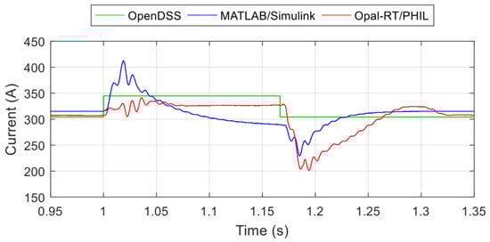 In [], PHIL tests were performed by connecting the physical PV inverter to a 15-bus distribution system with 2 other simulated PV systems, emulated using a three-phase dq design. Faults were simulated at locations closest to the substation, furthest from the substation, and at the PHIL-interfaced PV inverter). This work demonstrated the difference in fault currents using OpenDSS quasi-static time-series simulations, RT MATLAB/Simulink simulations, and a PHIL approach. The cases with PV that show the largest effects on the system are selected. OpenDSS provides steady-state results, whereas MATLAB/Simulink and the RT PHIL Simulation capture fault dynamics. The improvement in fidelity from the PHIL PV inverter is because it includes inductive and capacitive values that are not emulated in the dq PV inverter model and that are nonexistent in the OpenDSS PV inverters. Figure 6 shows the RMS PV inverter current when a 3 phase fault is applied at near the substation. Based on the modeling approach, the PV inverter phase A current varies. For OpenDSS, there is no instantaneous response available for the PV inverter. MATLAB/Simulink captures those transients, but interfacing the physical PV inverter provides an additional improvement in the model fidelity because it includes the output filter of the DER.