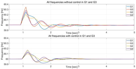 In this work, different algorithms were investigated for dampening oscillations on a well-known benchmark Kundur system []. Controller behavior was studied by closing the loop between PMUs and an OPAL-RT RTSM. The setup is as shown in Figure 7. The Simscape Power Systems toolbox of MATLAB was used to model the two-area Kundur model in the OPAL-RT RTSM, with 4-th order model generator equipped with a simple exciter model for transient stability studies. The analog output channels were assigned to the model voltage measurements of generators 1 and 3 and connected to two NITM Open PMUs. The Raspberry PiTM devices communicate with the PMUs with a Phasor Data Concentrator (PDC), to reproduce a realistic communication loop. In the Raspberry Pi, a conventional PI controller was implemented as the complement of the PSS of Generators 1 and 3. This control was translated in voltage and assigned to the analog output of the Raspberry Pi. This controller signal is added to the PSS output and directly connected to the input of the automatic voltage regulator. The results obtained following a 3 phase short circuit are depicted in Figure 8. The implemented wide area controller improves the power system behavior as expected during the test. A detailed paper is expected to be published with application of more advanced control algorithm applying ZHAW dynamic power system technique [] soon.