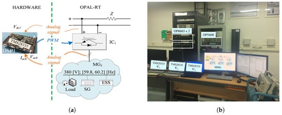 Power Hardware-in-the-Loop (PHIL) TU-Sofia Power System Stability Laboratory. (a) Micro/nanogrid lab setup; (b) Lab architecture.