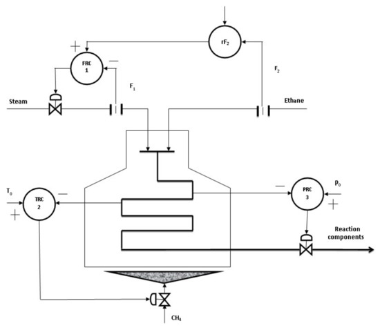 By taking the results of the thermodynamic reaction analysis from Section 2 into account, a control solution for the pyrolysis reactor was proposed, in order to handle two major aspects concerning the operation of the chemical process: to maintain a good ratio between the quantities of reactants, steam and ethane, that are given to the installation, in a proportion 4:1, and to ensure the reaction conditions regarding the temperature and the pressure inside the reactor. Furthermore, we have considered a control structure which involves three closed loops, presented in Figure 1: FRC-1, control loop for steam/ethane flow ratio; TRC-2, control loop for temperature; PRC-3 control loop for pressure.