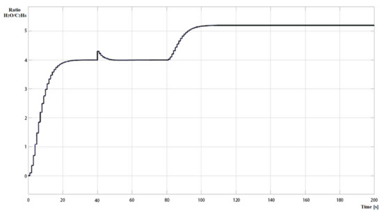 To validate the performances in closed loop, the Matlab/Simulink simulation environment was used. The results of the simulation are shown in Figure 3. It can be noticed that the RST controller ensures in closed loop both tracking and regulation performances for the steam/ethane ratio system [12,21].