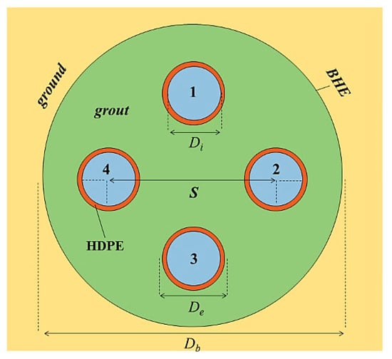 The case under study is a double U-tube BHE surrounded by the ground, composed of HDPE U-pipes sealed with the grout. A customary BHE with diameter Db = 152 mm was considered, with U-tubes having an internal diameter Di = 26 mm and external diameter De = 32 mm. The ground surrounding the BHE was modeled as a cylinder coaxial with the borehole, having a diameter equal to 10 m and a length 10 m longer than the BHE. The model of the BHE lower section was simplified by eliminating the U-junction at the bottom of the U-loop. It is well-known that the removal of a U-shaped connector has no considerable effect on the obtained results and that it significantly reduces the computational cost [38]. Various values for the shank spacing were selected, ranging from 65 mm to 105 mm. In addition, four different borehole lengths were considered, namely 50, 100, 150. and 200 m. A sketch of the borehole cross-section is illustrated in Figure 1.