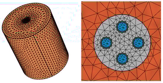 A 3D transient finite element code, implemented through COMSOL Multiphysics, was developed to solve the conjugate heat transfer problem for a working period of 100 h. The selected operation period is adequate to reach a steady-flux regime. The time-dependent “PARDISO” solver with non-uniform time steps was employed to solve the transient heat transfer problem. Values of the relative and absolute tolerance were set equal to 10−3 and 10−4, instead of the default values, to improve the precision of simulations. The unstructured tetrahedral grid was utilized to mesh the computational domain. The selected mesh for final computations, shown in Figure 3, contains approximately 1.6 × 106 tetrahedral elements, varying to some extent with the BHE configuration.