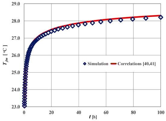 Comparison of the time evolution Tf,m obtained through the numerical simulation and that determined by applying the correlations.