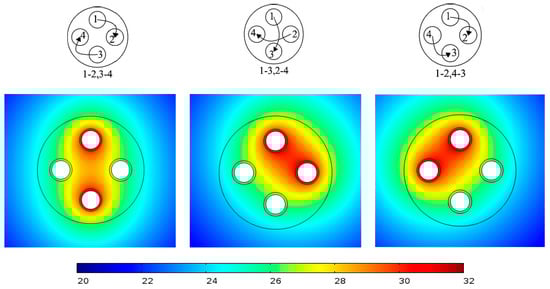 Isothermal contours, presented in Figure 5, display the temperature distribution inside and around the double U-tube BHE with different circuit arrangements, at horizontal surface z = 0 and at t = 100 h. The figure demonstrates that configuration (1-2,3-4) has a distinct temperature distribution; it shows a higher thermal interference between the upward and downward flowing legs, compared with two other configurations, namely (1-3,2-4) and (1-2,4-3). In the following, it will be shown that the higher thermal interference, namely thermal short-circuiting, flowing between legs of such configuration leads to a lower thermal performance in comparison with other configurations.