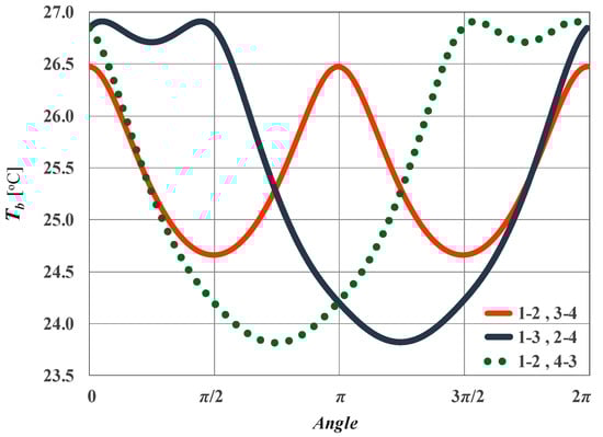 Figure 6 demonstrates the angular temperature distribution along the BHE perimeter, at horizontal surface z = 0 and at t = 100 h. It should be noted that angle 0 refers to the upper point of tube no. 1 in Figure 1. The plots show the non-uniformity of the temperature distribution along the perimeter of the borehole. It is evident that configurations (1-3,2-4) and (1-2,4-3) have a symmetrical temperature distribution along the BHE surface, with identical maximum and minimum temperature values equal to Tb-max = 26.91 °C and Tb-min = 23.82 °C, respectively.