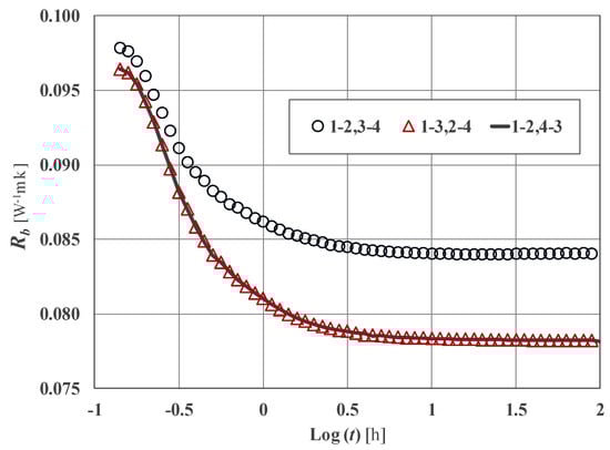 Plots of the borehole thermal resistance, Rb, versus a logarithmic scale of time in hours are presented in Figure 7. The figure shows that plots of Rb reach a time-independent value, particularly after the first 2 h of simulations. The figure demonstrates a significant difference between the thermal resistance of configuration (1-2,3-4) and configuration (1-3,2-4) or (1-2,4-3), with normalized mean square deviation equal to 6.71%. Aside from the very first minutes, the difference between the borehole thermal resistance of configurations (1-3,2-4) and (1-2,4-3) is vanishing; this confirms that for a symmetric disposal of the tubes and equivalent mass flow rates, the thermal performance of these configurations can be considered identical.