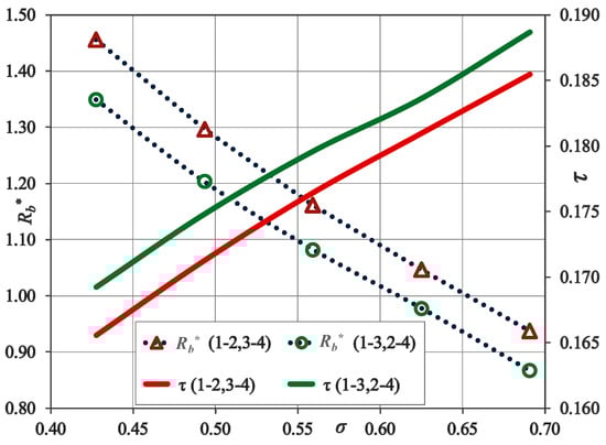 Figure 8 displays the variations of the dimensionless borehole thermal resistance, Rb*, and dimensionless outlet fluid temperature, τ, versus dimensionless shank spacing, defined as σ = S/ Db, at t = 100 h. The figure shows that the dimensionless thermal resistance, defined as Rb* = 2π kgd Rb, is a decreasing function of the shank spacing; the wider the shank spacing, the lower the BHE thermal resistance. For different shank spacing values, it is evident that configuration (1-3,2-4) has a lower thermal resistance compared with configuration (1-2,3-4), with an average difference of 7.17%.