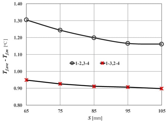 The thermal short-circuiting causes the averaged-over-the-depth mean fluid temperature (Tf,m in Equation (7)) to deviate from the arithmetic mean of the inlet and outlet temperatures, namely the average fluid temperature (Tf,ave in Equation (10)). Figure 9 demonstrates the difference between the mean fluid temperature Tf,m and average fluid temperature Tf,ave for various shank spacing values. The figure shows that the difference between Tf,ave and Tf,m decreases with increasing shank spacing for both circuit configurations. However, the decreasing trend for the plots is not of the same order.
