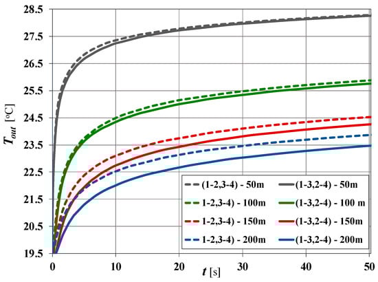 The figure clearly demonstrates that the difference between Tout in two configurations significantly depends on the borehole length. While this difference at t = 50 h for a BHE with 50 m length is negligible (around 0.02 °C), it exceeds the 0.4 °C for a BHE with 200 m length. As shown in the previous section, this difference may increase for closer spaces between tubes. The figure indicates that for boreholes deeper than 100 m, the circuit arrangement can significantly affect the value of the BHE outlet temperature.