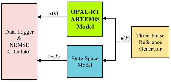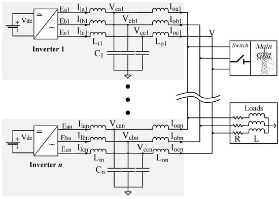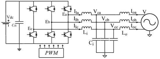 The circuit used to develop the proposed model in grid-connected mode is shown in Figure 2. The output of a three-phase inverter is driven by a Pulsed-Width Modulated (PWM) signal, which is filtered using an inductor–capacitor–inductor (LCL) output filter. The inverter is connected to a stiff voltage source that represents the main grid. Input inductor current, capacitor voltage, and output current are denoted by , , and , respectively.
