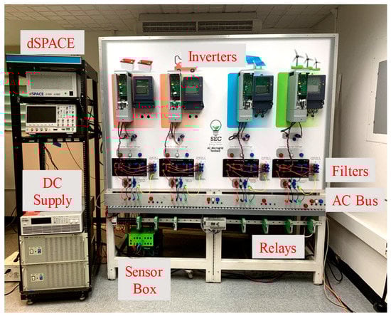 For safety reasons, the open-loop model of the grid-connected and islanded microgrid were not validated in a real experiment. Instead, these models were validated using an OPAL-RT OP5700 Real-time simulator. The closed-loop models were validated using the setup shown in Figure 4. This setup uses four Danfoss 2.2 kVA inverters with LCL filters and four sensor boxes with voltage and current sensors from LEM International. These four inverters may be dynamically connected to the AC bus. The AC bus may also be dynamically connected or disconnected from the main grid using solid-state relays handled with a programmable logic controller (PLC). To implement the control algorithms, a dSPACE 1006 simulator was used to read the signals from the sensor boxes and send the 10 kHz PWM pulses via optical fiber.