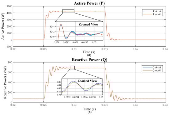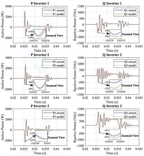 For this experiment, the inverter output voltage and main grid voltage started with the same nominal amplitude and phase. At , the inverter output amplitude was duplicated to a peak value of and returned to the original value at . Figure 6 shows the active and reactive power values for the mathematical model and circuit. Zoomed views in Figure 6 show that active and reactive power for the mathematical model and circuit have similar dynamics. However, there are small high-frequency oscillations in the power of the circuit. These oscillations are generated by IGBT transistor switching at a frequency of .