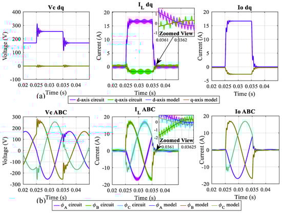 State-vector waveforms for the mathematical model and the circuit in grid-connected mode. (a) dq frame. (b) ABC frame.
