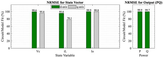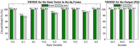 The NRMSE value was also analyzed for the shared power and the state vector in the dq frame. Figure 14 shows that fitting values are above 98% in all the state variables except for the input inductor currents, which decrease due to the presence of the 10 kHz PWM switching. These results validate the accuracy of the proposed model for the islanded microgrid.