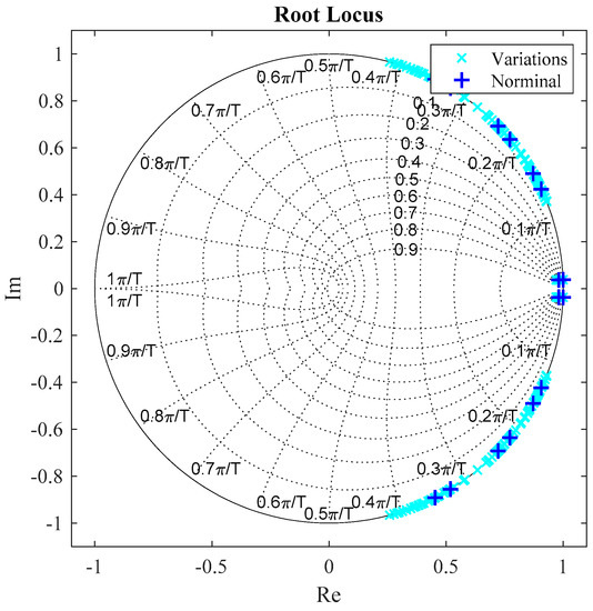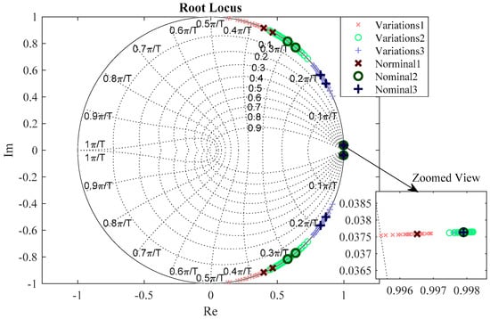 Open-loop eigenvalues of nominals , , and and their variations are shown in Figure 9. As seen in the zoomed view, the eigenvalues remain inside the unit circle, which implies that all the inverters were stable in grid-connected mode without a controller. However, after analyzing the stability margins, none of the open-loop models were closed-loop stable using unit feedback.