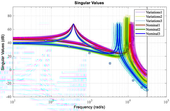 Singular value diagrams of the nominal , , and and their variations are shown in Figure 10. According to these diagrams, frequency responses of Inverters 2 and 3 are similar, with variations on their resonant and crossover frequencies. Moreover, Inverter 1 has the fastest dynamics followed by Inverters 2 and 3, respectively.