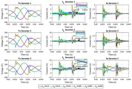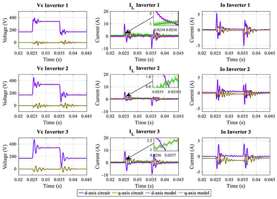 For the islanded mode, the scenario was simulated using an OPAL OP5700 real-time simulator with the ARTEMiS library for power electronics devices [31]. The ARTEMiS library was used to perform accurate simulations that considered the switching behavior of power electronic devices. To validate the mathematical model, the LCL component values from Table 1 were used. For this experiment, the output voltage of the three inverters and the main grid started with the same nominal amplitude and phase. At , the inverters’ output amplitude was duplicated to a peak value of and returned to the original value at . Figure 11 shows the active and reactive power waveforms for the mathematical model and circuit. State vector waveforms in the dq frame are shown in Figure 12 and in the ABC frame in Figure 13. The active and reactive power for the mathematical model and circuit have similar dynamics. As detailed in zoomed views, input inductor currents showed switching oscillations. These oscillations were caused by the IGBT transistors switching at a frequency of . However, state vector dynamics show similar behavior in steady state and during transient response.