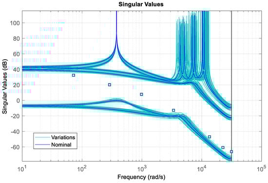 Open-loop eigenvalues of and its variations are shown in Figure 15. All the eigenvalues remain inside the unit circle, which implies that the open-loop microgrid is stable in grid-connected mode without a controller. However, after analyzing stability margins, none of the open-loop models were closed-loop stable using a unit feedback. Finally, the singular value diagrams of the nominal and its variations are shown in Figure 16. These diagrams show similar behavior compared to Figure 10. However, there is an additional response below that is related to the RL load.