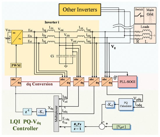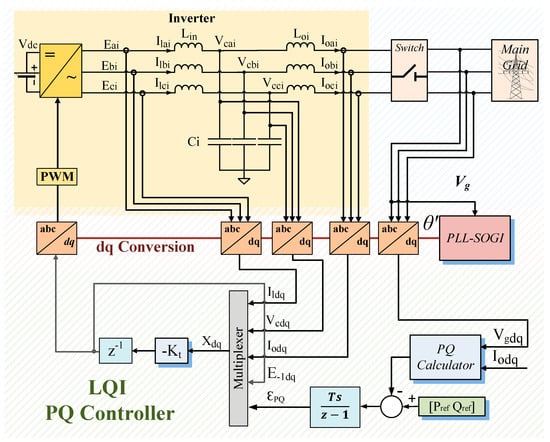 The controller presented in this section is designed for each inverter independently. The control scheme for one inverter is shown in Figure 22. Each controller contains an internal LQI controller to regulate the output voltage Vcdq. The voltage reference of the LQI controller is generated by the PQ/Vdq droop–boost controller according to the active and reactive power demanded by the load. The AC bus reference is set to nominal values such that .