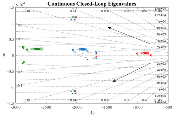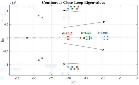 For this experiment, the three inverters have the same rated power. However, for visualization purposes, the droop matrix relation was initially defined as D2 = 0.9D1, and D3 = 0.95D1. The droop matrix for Inverter 1 was defined as . The closed-loop eigenvalues for the islanded microgrid for different values of d are shown in Figure 24. As d increases, the closed-loop eigenvalues tend to the right half plane indicating instability.