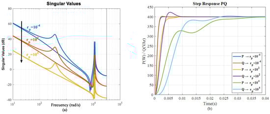 Performance analysis for the variations in . (a) Singular value plot; (b) step response.
