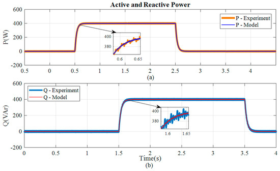 Comparison between the experimental and mathematical values for the active and reactive power under a step reference of 400 W and 400 Var. (a) Active power; (b) reactive power.